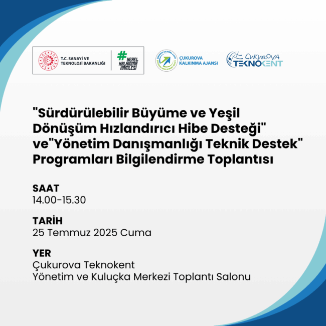 Çukurova Teknokent’te, “Sürdürülebilir Büyüme ve Yeşil Dönüşüm Hızlandırıcı Hibe Desteği” ile…